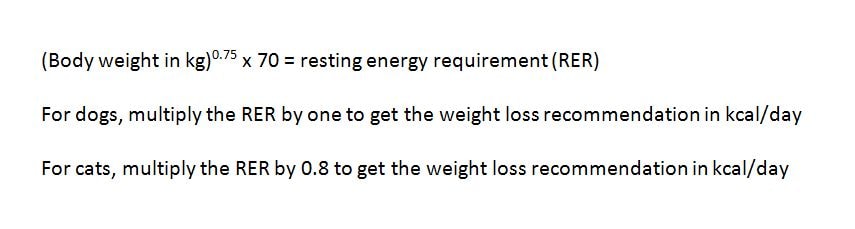 I’m afraid there is just no way to avoid doing some math when it comes to determining how much of a particular food you should feed to achieve weight loss. First, owners need to know how many calories their pets should be taking in. Your pet’s veterinarian is your best source for this information, but if you want to do the calculations yourself, here are some typical formulas:
