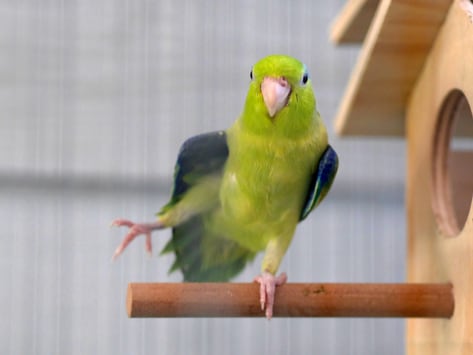 The other species of parrotlet commonly kept as a pet is the green-rumped parrotlet, which is smaller than the Pacific parrotlet and a little shier and less active. Males have blue feathers on their wings, while females do not. Males have dark blue primary (outermost) wing feathers, while their secondary (innermost) wing feathers are turquoise. Females have a patch of yellow feathers between their eyes, above their beaks. Green-rumped parrotlets are the only species of parrotlet that does not have blue on their backs.