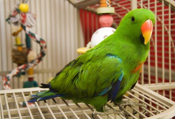 The eclectus parrot is a medium sized bird at 17–20 inches long and weighing 13–19 ounces. They are considered gentle but do require a moderate amount of care in addition to socialization and are not an ideal “beginner” bird. However, eclectus parrots are a good bridge for an intermediate bird owner before jumping into the “advanced” species.