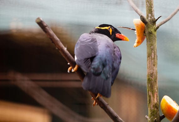 Mynas generally adjust well to being caged, and their diet is heavily fruit based, which means that the poop is soft, runny, and fairly smelly. This means that care and feeding is more intensive than many other birds. Rather, the myna requires a specially prepared, heavily fruit laden diet. For owners able to put in the work and maintenance required by these special birds, the reward is up to 25 years of companionship.