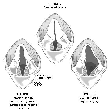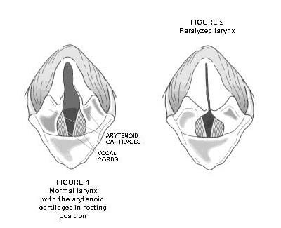 - Laryngeal paralysis: (most common) A disease in which the muscles that open the larynx/voice box become weak due to a degenerative disease of the nerves and muscles that allow the larynx to open and close normally.