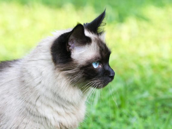 Cats are dichromats. They do not perceive reds. Their visual acuity is very poor compared to humans because they do not have a fovea in their retinas.