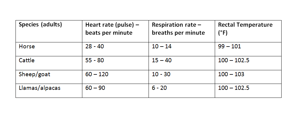 For whatever species you happen to have, knowing the vital signs for that species is extremely helpful when evaluating an animal in an emergency situation. If you have trouble remembering numbers, at least have them printed out and kept in a tack or feed room for reference. This sort of information is great to pass along to your vet when you first call her as well. Here are some basic guidelines to get you in the ballpark: