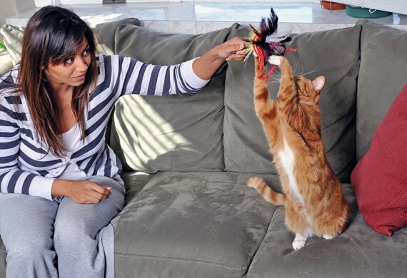 Spend at least 20-30 minutes a couple of times a day actively engaging your cat in play. Your cat will appreciate the time with you, get more exercise (helping to keep him fit), and be less anxious.