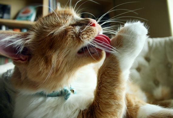 Cats affected with arthritis may also begin to lick at, chew or bite at body areas that are painful. This may even reach the point of causing inflamed skin and hair loss over affected areas.