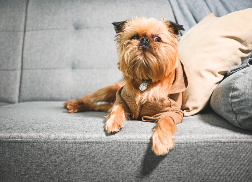 A brown scruffy Brussels Griffon lying on a gray couch.