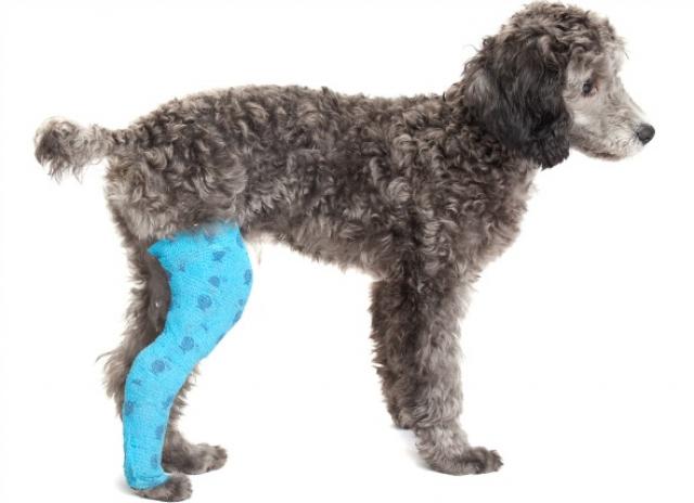 If your dog is wearing a bandage, be sure to always keep it clean and dry. Do not attempt to change the bandage at home but do monitor the bandage at least daily for signs of slippage, soiling, swelling of the distal extremities, and increased irritation by the dog (such as attempts to chew, lick, or scratch). All can be signs that the bandage needs to be changed.