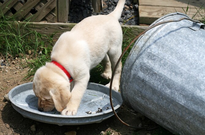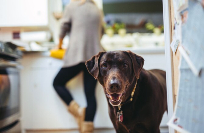 “From a veterinary perspective, there is no good trash for a dog. I strongly recommend a covered trash can, preferably in a closet, anchored or elevated,” says Denish. “It is also very important to start training your dog from the beginning. That means minimizing your dog’s diet to no table food; don't let them beg; and crate train them if possible. This way you have some control over the dog's behavior when you are not home.”