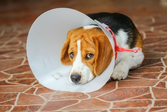 Your veterinarian will often treat a happy tail injury with bandaging to protect the wound, Elizabethan collars to avoid licking/chewing, and sometimes pain medication and antibiotics. The bandaging allows time for the wound to heal and protects your dog’s tail as they continue to wag it and bang it against objects.