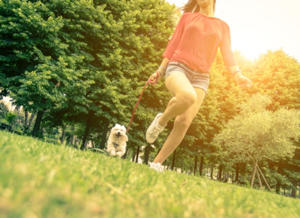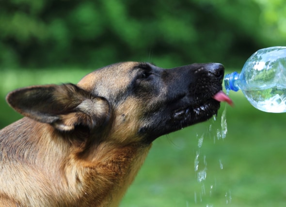 You should always have a water bottle and a collapsible dog travel bowl (such as the Prima Pets Collapsible Travel Bowl) with you during outdoor dog exercising activities so your dog has access to cool, fresh water. Dr. Stephens suggests pausing every 15 minutes to take water breaks.