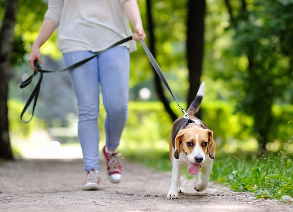 It is important to know the signs of heatstroke in dogs so that you can make sure your pet is enjoying their outdoor time. Many dogs will stop walking, seek shady spots to rest, or walk closer to their owners if they’re overexerted. “Look for signs of stress, such as excessive yawning or blinking; panting or [signs of] dehydration, such as dry gums; or changes in your pet’s behavior, such as walking in front of you or tugging on the leash. If your dog will allow it, you can gently work up to taking your pet’s temperature with an ear thermometer yourself. The normal temperature range for dogs is 101 to 102.5,” says Dr. Linder.