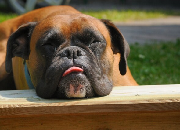 Boxers are known for their playfulness and boundless energy, says Dr. Hughes. “They are also known for their ‘boxing’ ability, where they will jump up and try to box with their front feet. Some owners of Boxer mixes will report this tendency as well. As for physical traits, you may notice a bit shorter muzzle, the dark facial mask, the muscular body and a brindle coat color.”