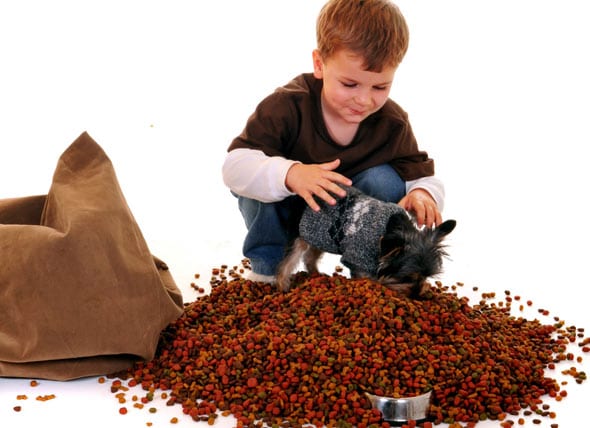 Pet food bags that aren’t stored in a sealed container should be placed in a cupboard so dogs and cats can’t help themselves to extra meals. Use a cabinet latch if you have to!