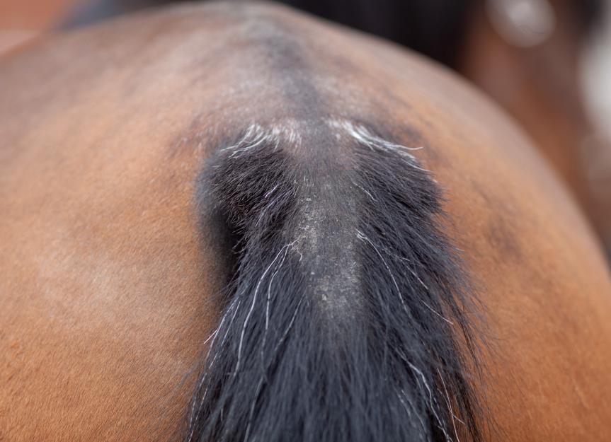 If there is no significant evidence of other allergies or parasitism, your veterinarian will check your horse’s sheath or udder. Smegma (a combination of shed skin cells, skin oil, and moisture), dirt, and secretions from the horse’s skin can build up in the sheath and become irritating. Horses are not good at itching this area directly so will often rub their tails to try to get some relief. Your veterinarian will clean the area and remove the irritating debris.