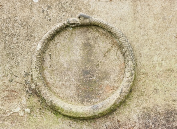 The tail-eating serpent is one of the oldest tales known to humans. According to ancient Egyptian legend, when the sun god Ra merged with Osiris, ruler of the underworld, to form a new divine entity, two serpents representing the protective snake-god Mehen slithered around the newborn super-god holding their tails in their mouths. In Norse mythology, the serpent is Jörmungandr, an enormous sea beast and one of the monstrous children of the god Loki; a being so large it encircles the whole world, holding its tail in its mouth. One day, prophecy says, it will release its tail from its mouth and rise from the ocean depths to harken Ragnarök—the end, and rebirth, of earth.