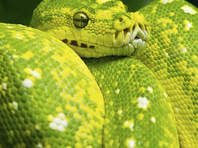 Boas are usually calm, solitary snakes but will hiss loudly if they feel threatened. To detect prey, boas have heat-sensing pits on the sides of their heads and small, hook shaped teeth that help them hang on to prey while they constrict around them.